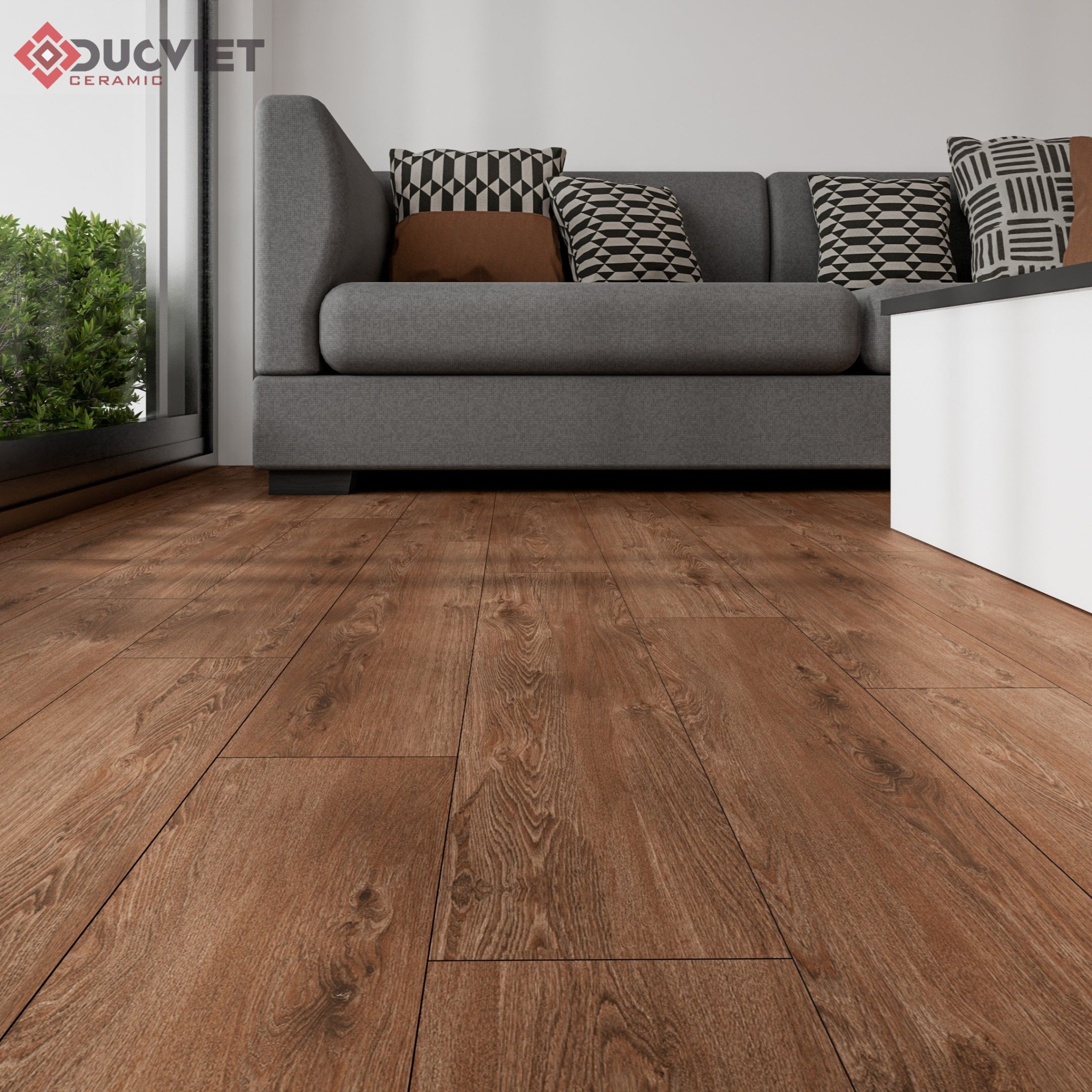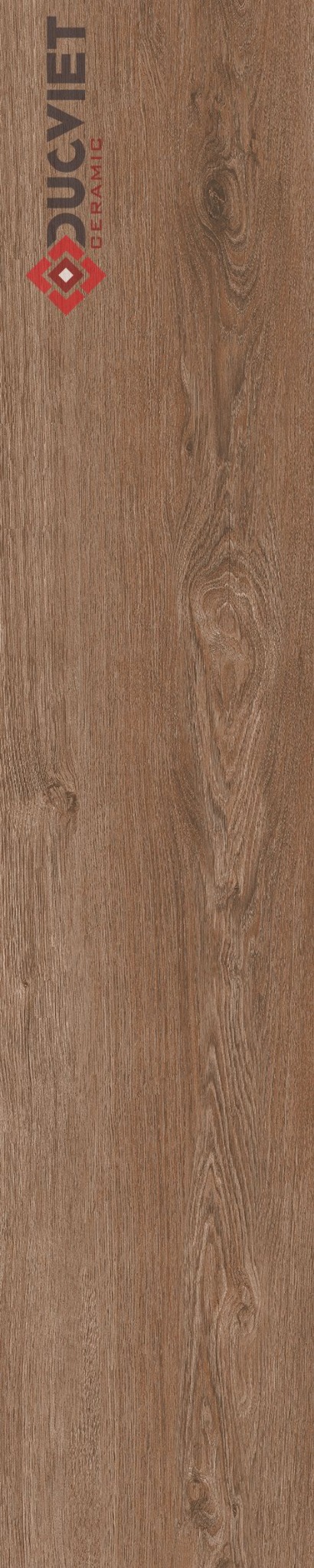 Gạch được in bằng công nghệ kỹ thuật số với mật độ vân gỗ cao hiện rõ được mắt gỗ hình xoắn hoa trên gam màu nâu đỏ là chủ đạo.